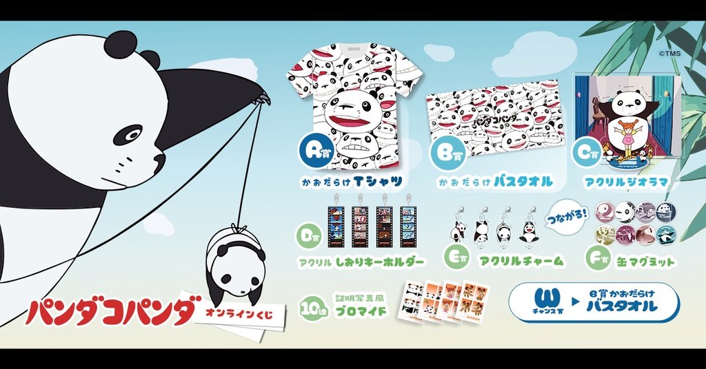 本オンラインくじは、パンダコパンダのキャラクターたちの魅力が詰まったシーンを多数使用しています。賞品には、かおだらけアイテムをはじめ、日常でも使用しやすいアイテムなど、バリエーション豊かなアイテムをご用意しました。