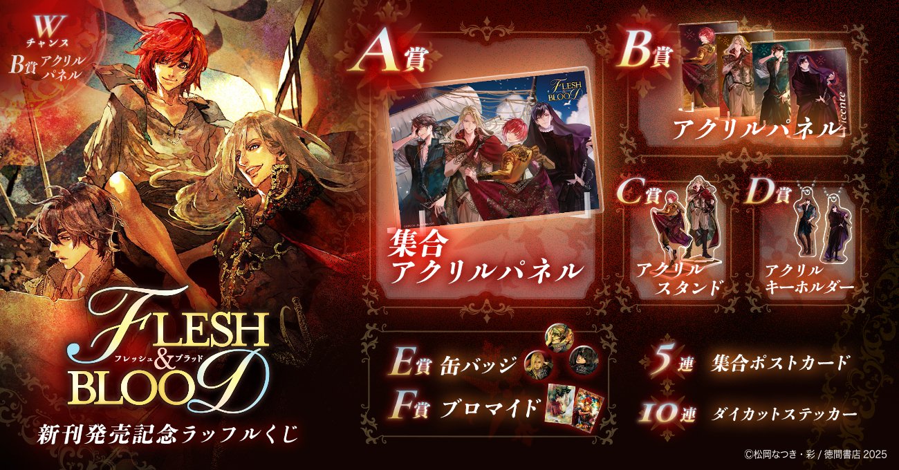本オンラインくじでは、『FLESH&BLOOD』の世界観を彩る、多様なシーンを描いた彩先生の美しいイラストを多数使用しました。