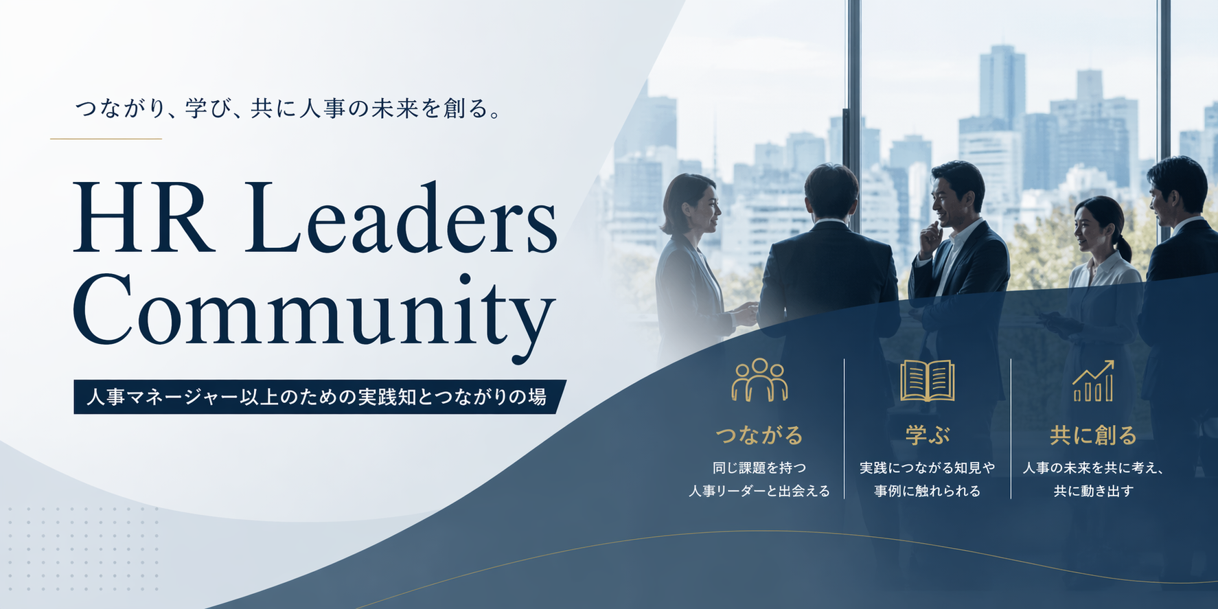 HR Leaders Communityは、「つながり、学び、共に人事の未来を創る。」をコンセプトに、人事マネージャー以上の方を対象として、似た課題を持つ人事リーダー同士の出会い、実践につながる知見や事例の共有、そして人事の未来を共に考え動き出す場を提供します。